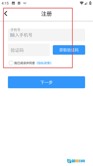 3、进入注册页面后,需要填写【手机号】,点击【获取验证码】并填写相关信息,勾选同意政策后点击【下一步】以推进注册流程。
