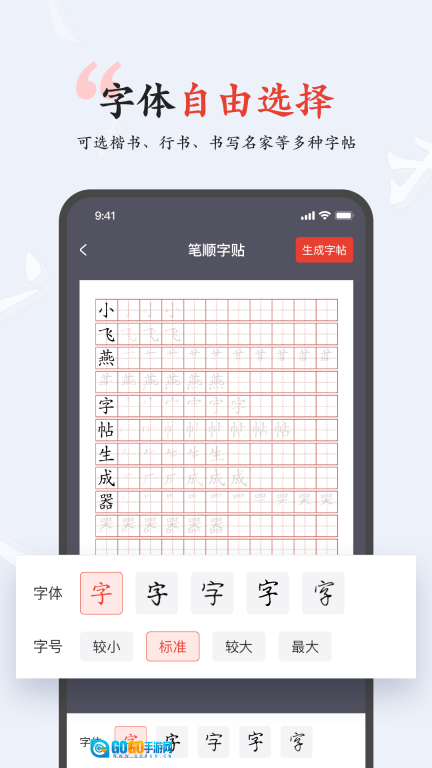 1、小飞燕字帖拥有丰富的字帖资源库,包含楷书、行书、草书、隶书等多种书法字体,能够满足不同用户的学习需求。