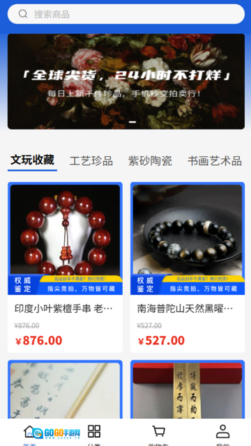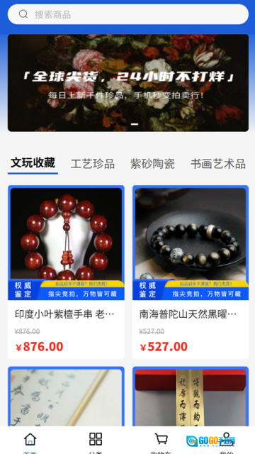 1、首页提供文玩收藏、工艺珍品、紫砂陶瓷、书画艺术品等类别的商品供用户选择;