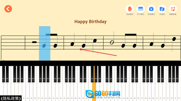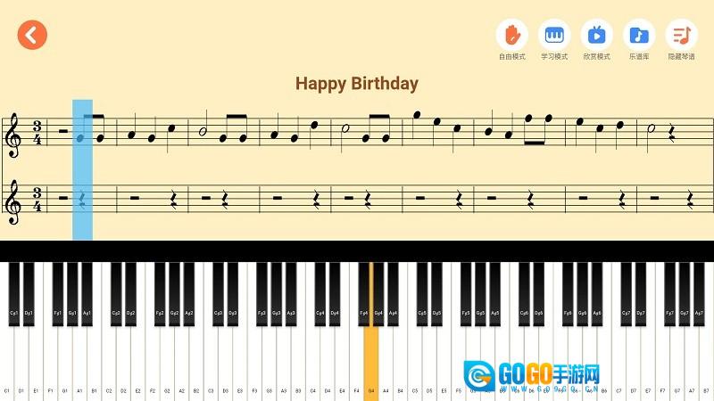 4、点击【显示琴谱】按钮,就能查看《Hy Birthday》这首曲目的琴谱,大家可以结合琴谱与钢琴键的提示来进行弹奏练习。