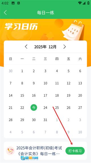 1、进入【每日一练】的【学习日历】界面,选择当天日期后点击【打卡练习】按钮,就能进入刷题环节了。