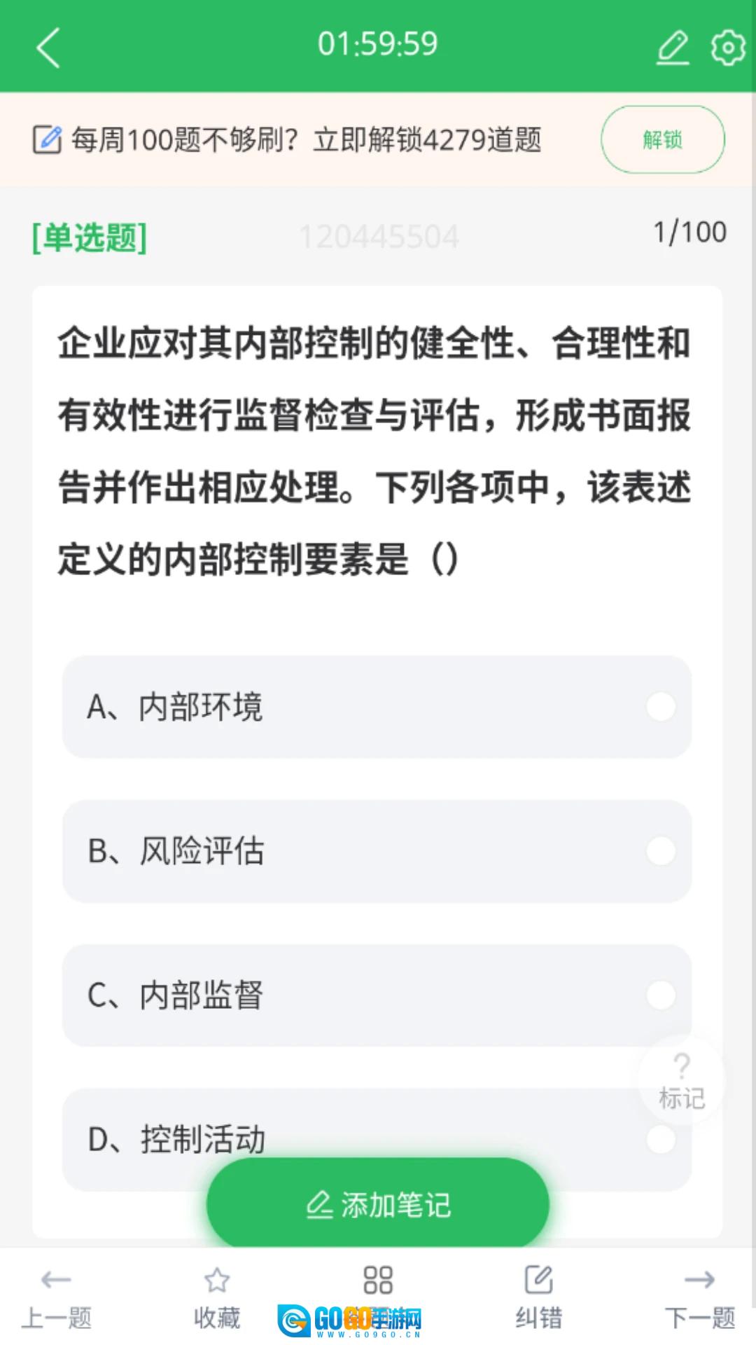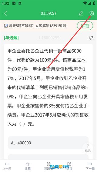 进入题目页面后,能够查看【单选题】的题干内容,另外点击右上角的设置图标,就可以打开学习设置相关的功能选项。