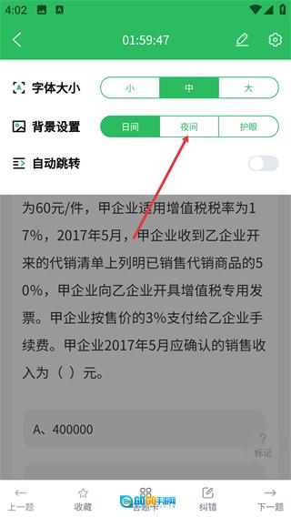 4、开启【夜间】模式后,题目页面将切换为深色背景显示,这样能让用户在光线偏暗的环境中更舒适地开展刷题练习。