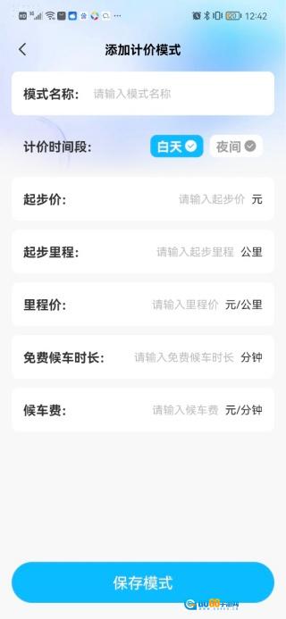 2、点击添加计价模式,填写模式名称、选择计价时间段,录入起步价、起步里程、里程价、免费候车时长和候车费,最后点击保存模式;