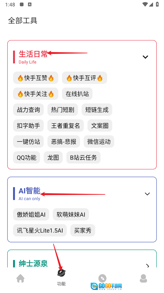 7、进入“功能”板块可对工具进行分类,你能随时在其中选择并使用所需工具。