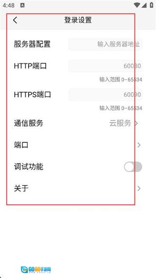 3、进入登录设置页面后,能够开展服务器配置工作,调整HTTP/HTTPS端口,挑选通信服务类型,设定端口参数,以及开启或关闭调试功能。
