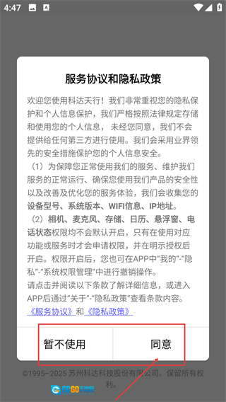 当进入科达天行的服务协议与隐私政策弹窗界面时,点击【同意】按钮即可接受相关协议并继续进入应用。