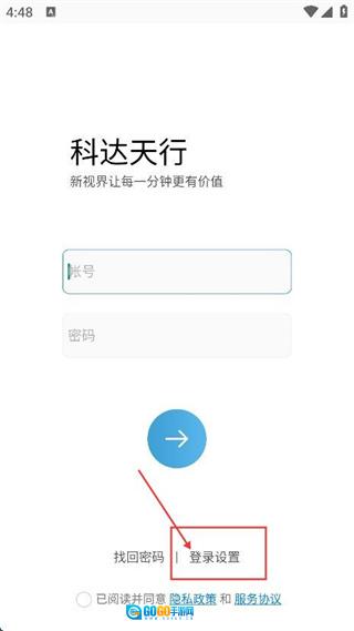进入科达天行的登录界面后,要在相应的输入框中填写【账号】和【密码】;点击【登录设置】能够进入配置页面。