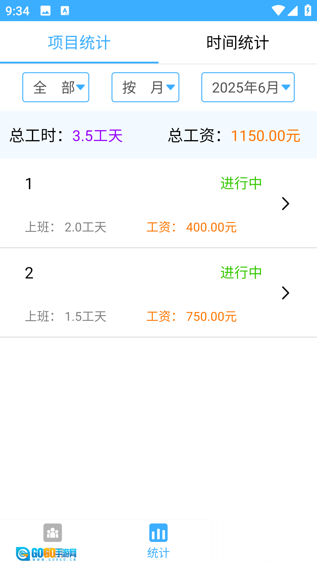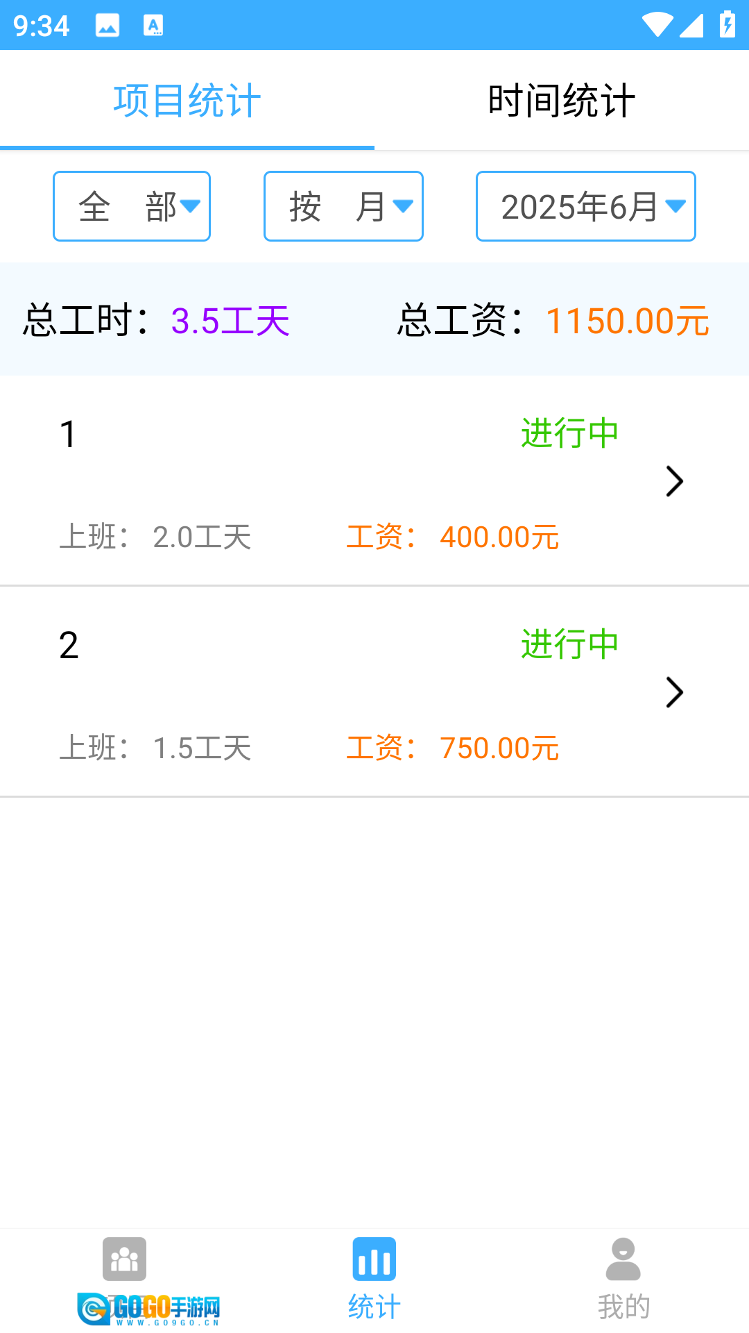 完成记录后,可随时进入【统计】界面,按项目或时间维度查看工时统计的结果。
