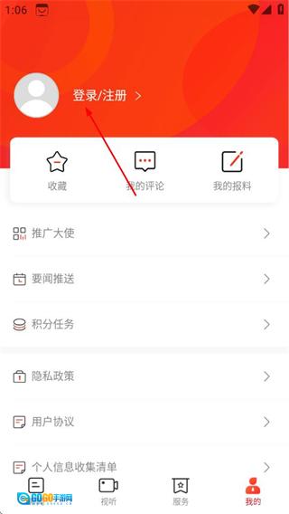 2、在个人页面,点击登录注册区域,进入登录界面。