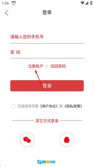 3、在登录界面,点击注册账户,进入注册页面。