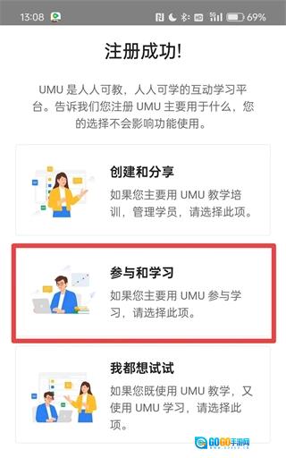 显示注册成功之后,选择“参与和学习”。