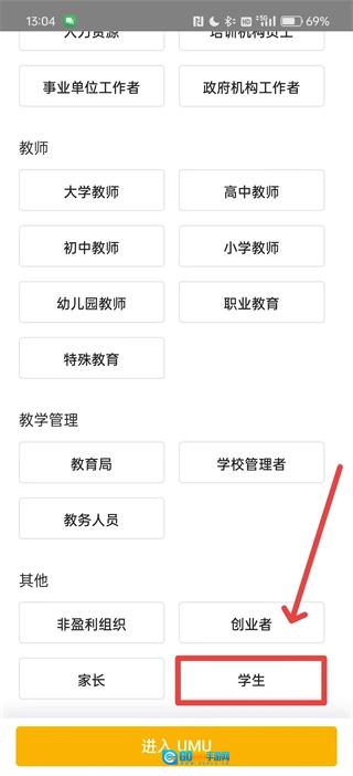 下滑至页面底部,在“其他选项”里找到“学生”并点击,接着点击“进入UMU”。