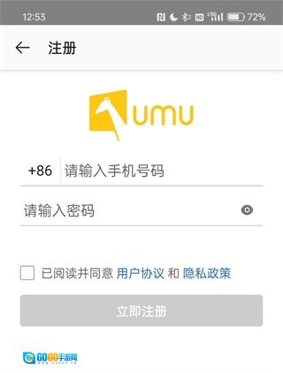 请输入手机号码,接着在下方输入新设置的密码,然后点击立即注册按钮。
