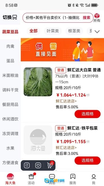 2、品类丰富齐全:供应商直接入驻平台,商品涵盖十一种分类,种类十分多样,从新鲜蔬果到肉类水产等应有尽有,能充分满足日常买菜的各类需求。