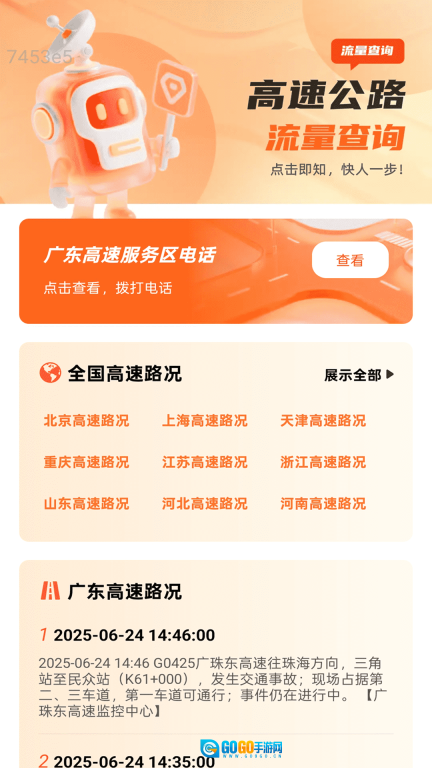 3、支持查询全国范围内的高速实时动态,涵盖交通事故、车道通行状态等具体情况,通过一键操作即可获取完整的路况信息。