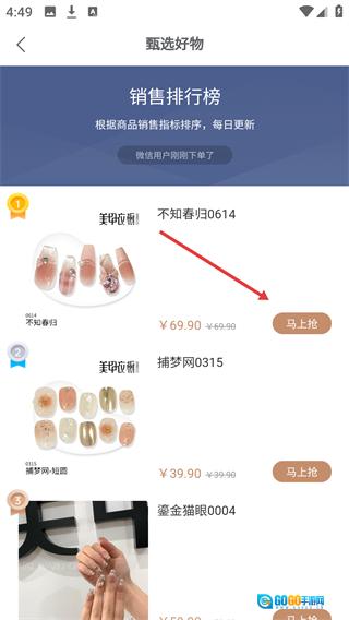 3、进入销售排行榜页面后,能看到按销量排序的美甲商品,点击商品旁的【马上抢】按钮即可进入商品详情页。