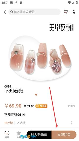 在商品详情页面,你可以查看美甲的款式、价格等相关信息,还能通过【加入购物车】【立即购买】等功能来完成下单操作。