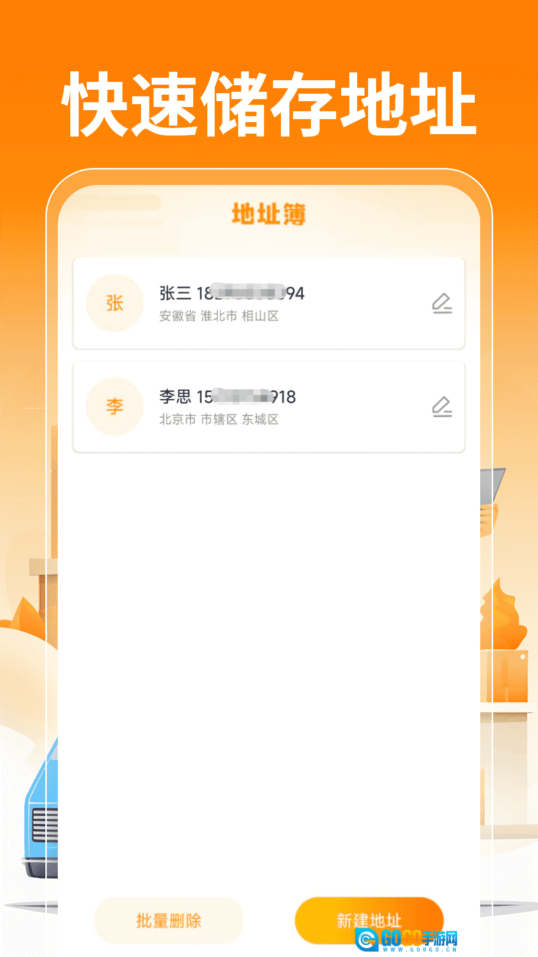2、支持地址快速储存,寄件时可直接选择已存地址,同时支持地址的新建、编辑以及批量删除操作。