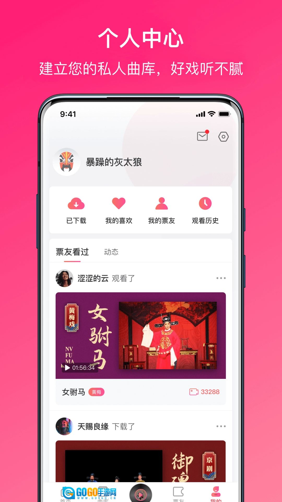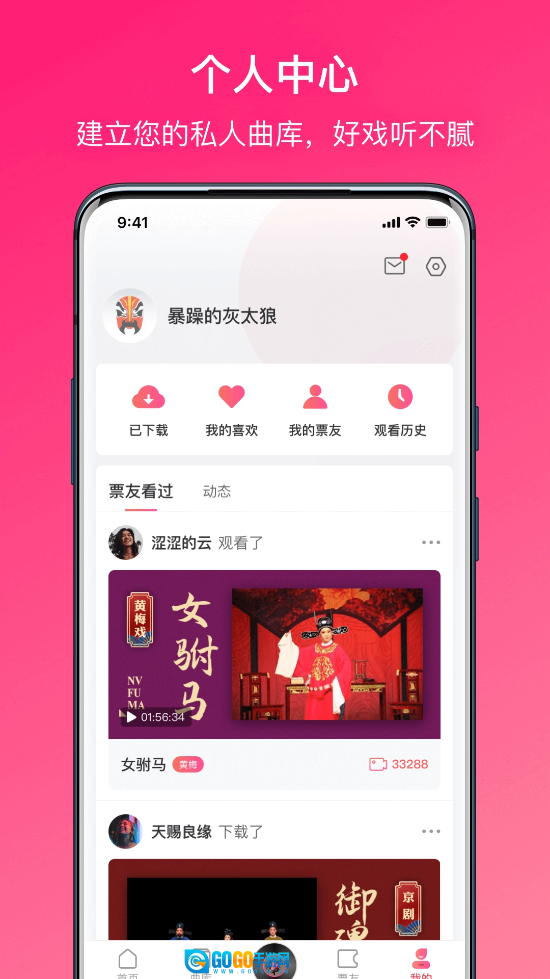 3、你总能发现更多戏剧相关的资源,支持收藏、关注票友、查看观看记录,轻松打造专属戏曲空间。