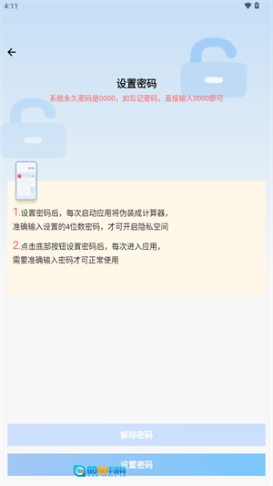 1、设置密码后,每次打开应用时它会伪装成计算器,只有准确输入预先设置的4位数密码,才能进入隐私空间。