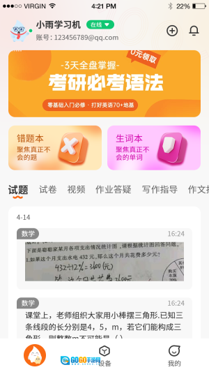 1、设备管理:可添加绑定小雨学习机等设备,实时查看设备运行状态,同步学习记录,对智能设备进行高效管控。