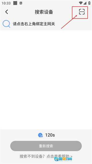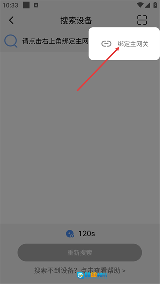 2、进入【搜索设备】页面后,点击右上角的对应图标,会弹出功能选项弹窗,目前提示需要绑定主网关。