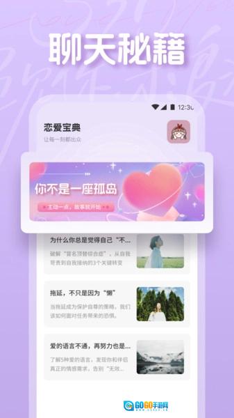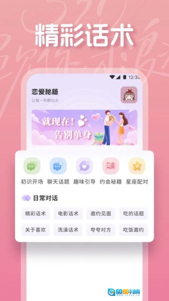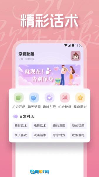 量话圈话术助手是一款专门为不擅长聊天的用户设计的话术学习平台,平台上的在线话术种类十分多样,不管需要哪种回答技巧的话术,直接搜索就能找到参考内容,而且可以一键复制自己需要的话术,帮助你提升说话能力。此外,平台还提供恋爱技巧和聊天秘籍等实用内容,各类情侣壁纸素材也能免费获取。