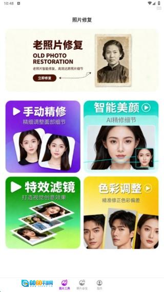 2、图片工具页面配备了老照片修复、手动精修、智能美颜、特效滤镜等实用功能。