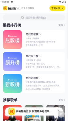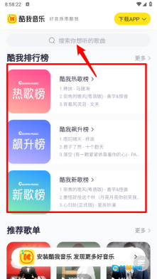2、一键即可开启,主页整合了多个音乐榜单资源,你可以点击顶部的搜索框来搜索歌曲。
