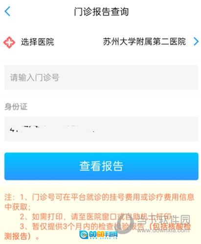 2、此处以门诊报告查询为例,操作步骤为:选择对应医院,输入门诊号,点击【查看报告】按钮即可完成查询。