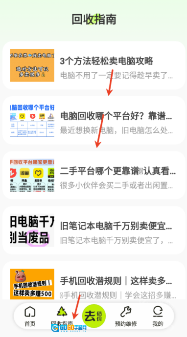 3、点击“回收指南”,查看各类不同的回收指南信息。