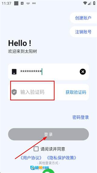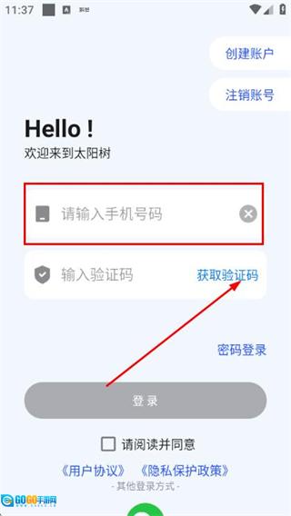 2、于登录页面输入手机号,勾选相关协议后,点击“获取验证码”按钮。
