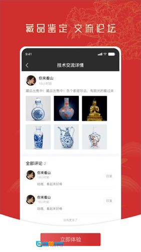 1、进入藏品鉴定交流论坛界面后,点击【立即体验】按钮,即可启动软件的使用流程。