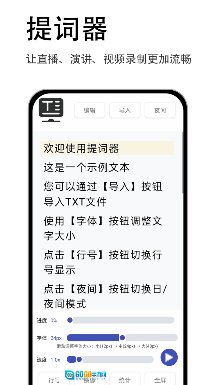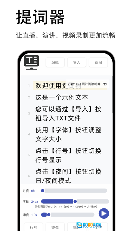 2、除了可以切换日/夜间模式外,还能对提词内容的字体大小、行号显示状态等进行调整,从而更贴合个人使用偏好。