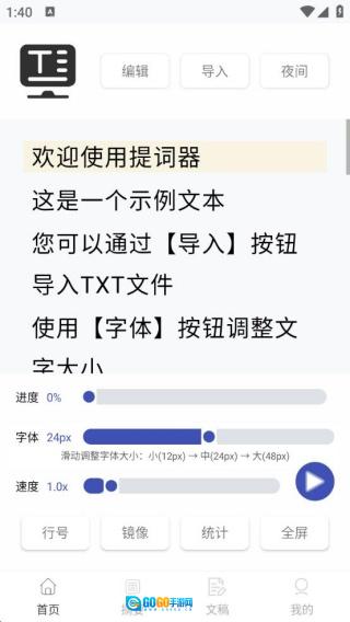 1、软件安装完成后进入首页,可对提词内容进行编辑,字体、进度、速度等均可根据需求调整。