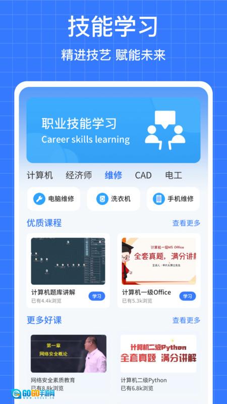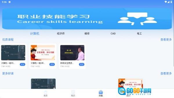 3、技能板块的课程资源同样十分丰富,包含计算机操作、CAD软件应用等内容,整体呈现得相当清晰明了。