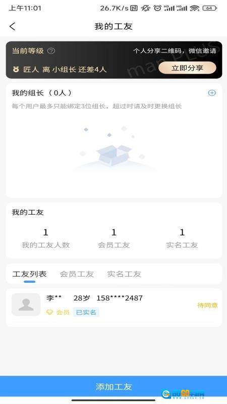 可以在线添加和管理工友,组长能随时掌握每位工友的状态以及工友总人数,管理工作变得更加轻松便捷。