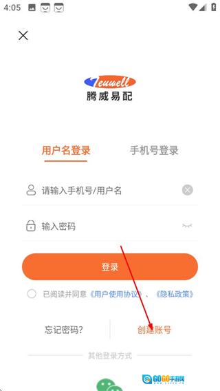 1、进入腾威易配的登录页面后,找到并点击创建账号的选项,即可跳转至注册页面。