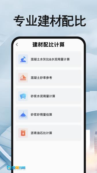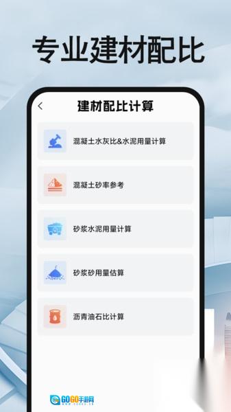 2、混凝土配合比、钢筋重量、砌体工程量等计算功能,可满足建筑工人、工程师、造价师等不同职业人群在施工现场与办公场景下的计算需求。