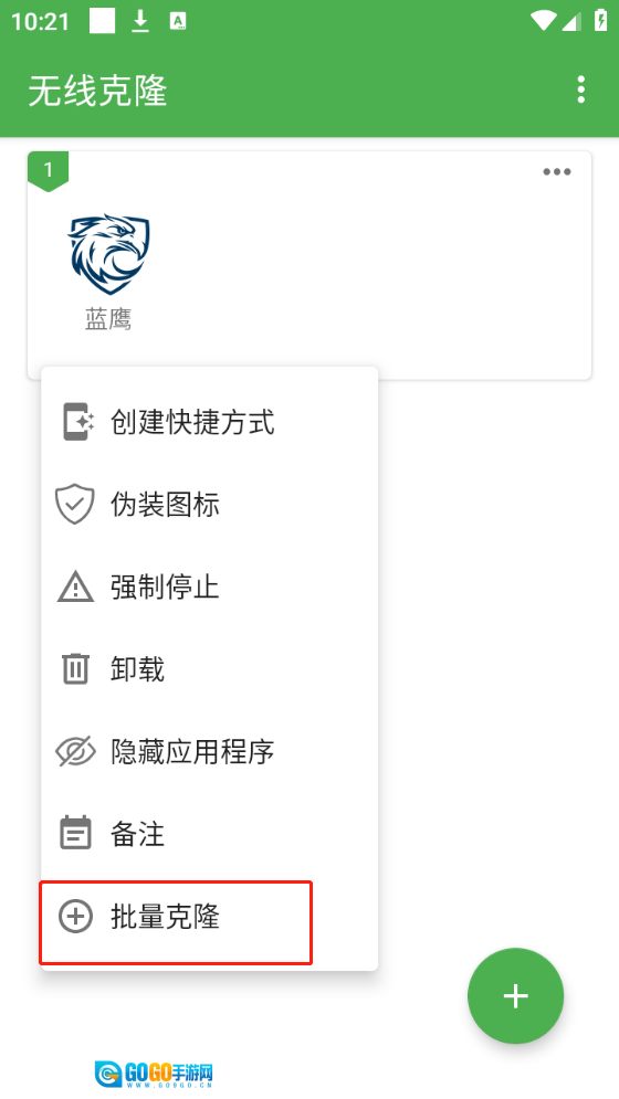3、点击想要克隆的应用,它就会显示在桌面上,接着长按这个应用,再点击“批量克隆”选项。