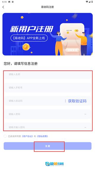 3、若尚未完成注册,可点击【去注册-链接】跳转至易收码注册页面,依次填写名称、手机号等所需信息,勾选相关协议后,点击【注册-按钮】即可完成新用户注册流程。