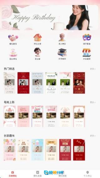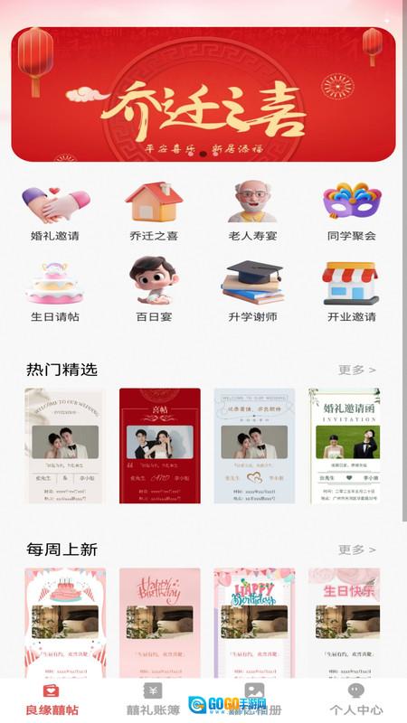 1、良缘囍帖页面集合了婚礼邀请、乔迁之喜、老人寿宴等各类喜帖素材,同时提供热门精选、每周上新、创意趣味等不同类型的模板,便于大家挑选。