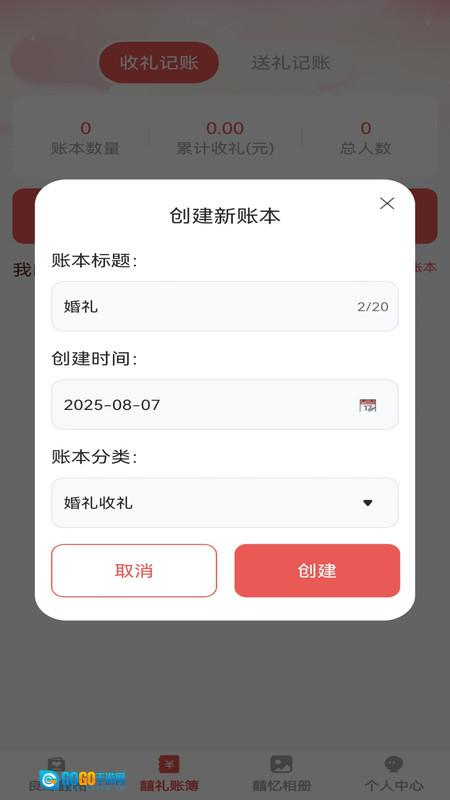 3、囍礼账簿页面配备了收礼与送礼的记账模板,支持分类添加,助力生成专属账单。