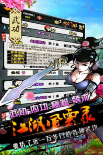 3、数量高达100多位的江湖侠士设定,不同的功法设置,可以进行任意的组合模式。