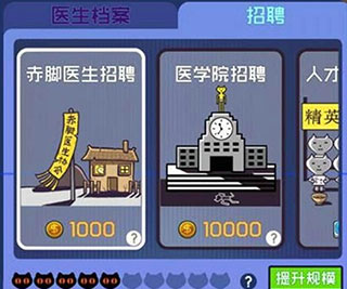 4、前期的招聘使用1000金币招聘即可,10000万金币的招聘就算出现好的医生多半也是招聘不起的。