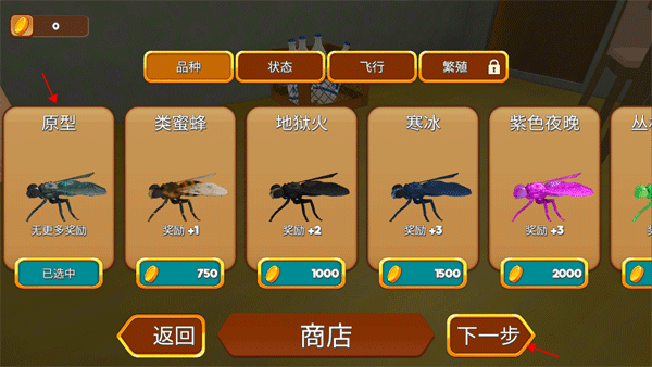 1、游戏的开始就是选择你的苍蝇的品种、状态、飞行等选项,选好后进入下一步。