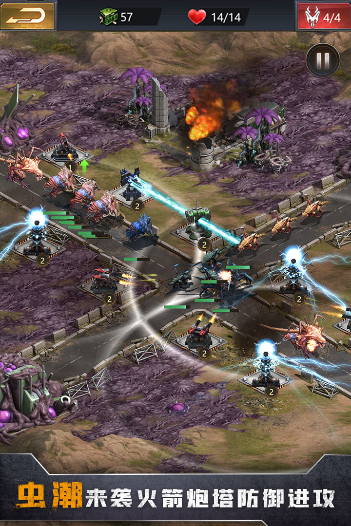 一款末日英雄VS虫族为背景题材的战争科幻类策略游戏。在公元2129年,大量陨石突然冲击地球,野心家煽动暴乱,人类天灾人祸双重打击。面对横空出世的外星虫潮和居心叵测的野心家,人类该何去何从?作为幸存者之一的你,是一个基地的最高长官,你将指挥你的军队在这战火横飞的乱世中生存下来。