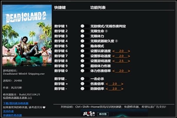 死亡岛2修改器(风灵月影)为玩家提供相当全面的修改功能,你可以在这里设置自己的移动速度,无限体力和无限生命的加持下,成为丧尸世界中超人般的存在,感受一招致命的快感,安装十分的简单,喜欢的小伙伴,点击下载感受吧。