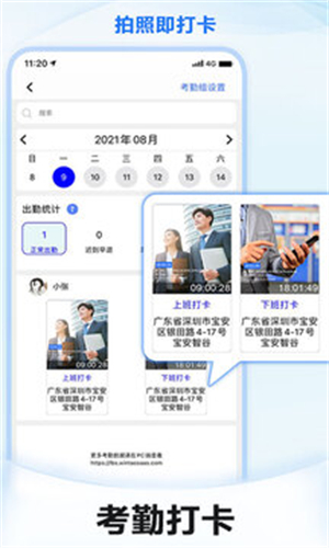 2、考勤自动统计:真实记录员工上下班时间、地点,当天出勤记录一目了然。